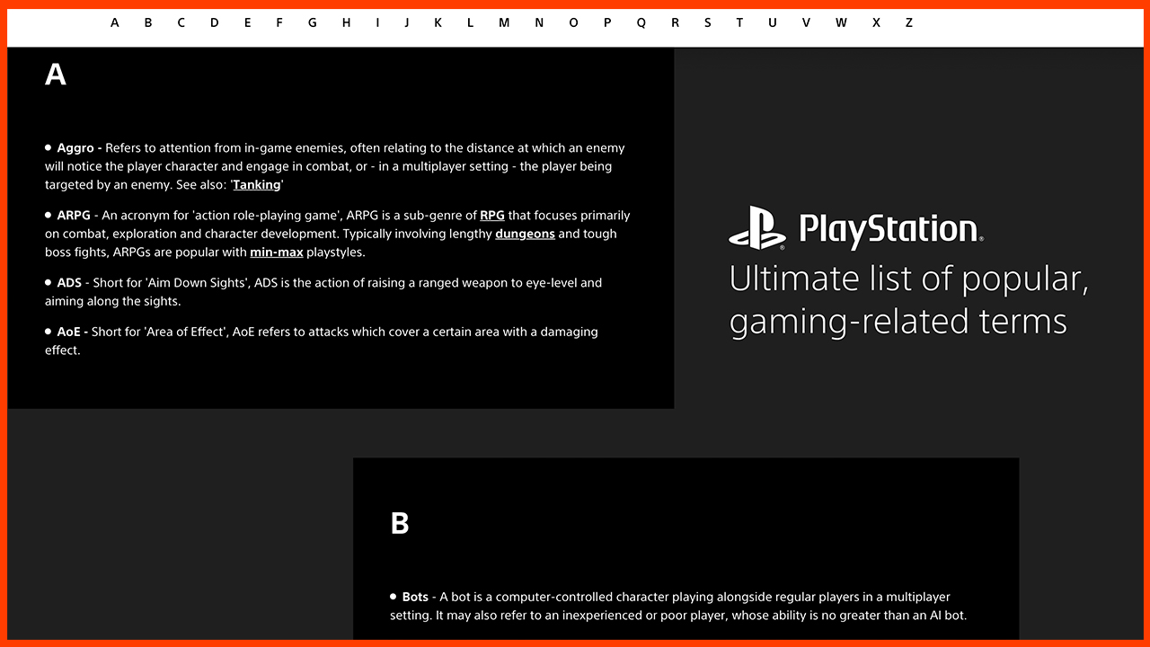 Eğer oyun dünyasıyla yakından ilgileniyor ve içinde neredeyse her oyun türünden kesitler barındıran bu sözlük ilginizi çekiyorsa, kolayca yeni oyun terimlerini çıkmak. Sözlük, PlayStation tarafından hazırlandığı; hâliyle sadece PlayStation’ı kapsayan birçok kavram de mevcut.