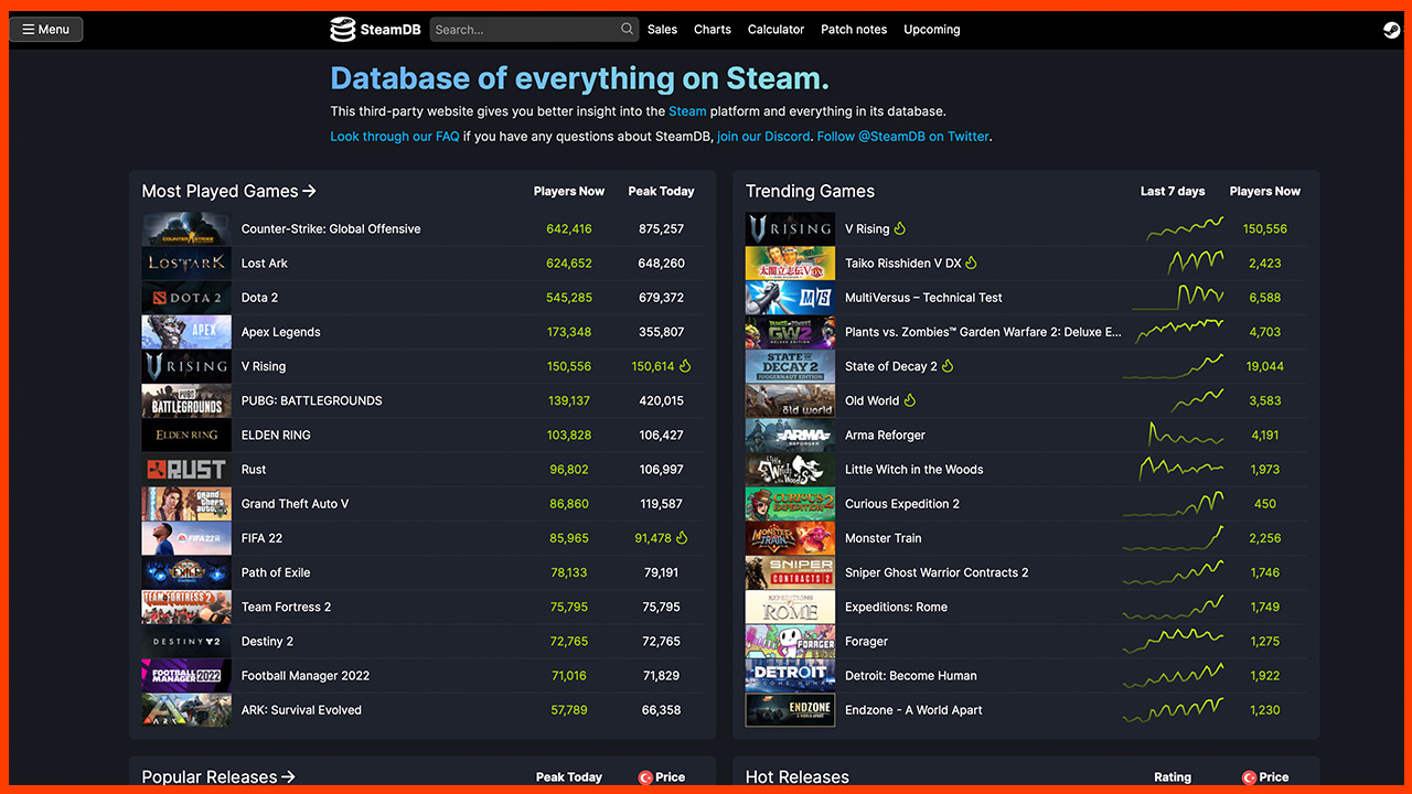 SteamDB, onun aktif Steam kullanıcısının hızla hizmete yarayabilecek bir internet sitesi. İçerisinde; Aynı PSPrices gibi fiyat hizmeti de sunan site, bir sonraki Steam indiriminin ne zaman geleceğinden, bir anda en çok oynanan oyunlara kadar birçok bilgi sunuyor.
