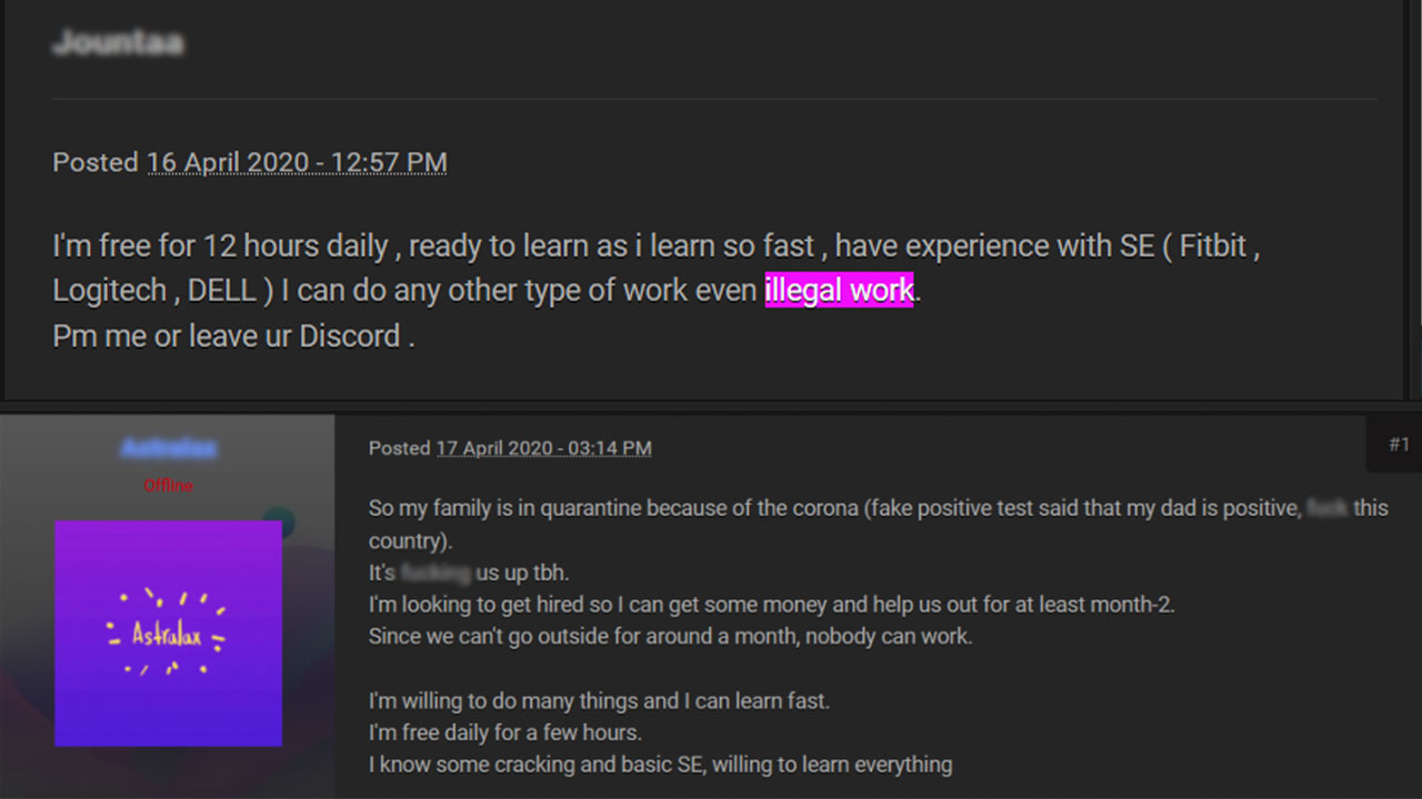 Kaspersky’ın kanıtlarında artı çeşitli forumlardaki kullanıcıların yasadışı yollardan para kazanmak için iş arayışlarını da DarkWeb üzerinden yaptıkları belirtiliyor. yukarıda gördüğünüz örnekteki gibi Fitbit, Logitech gibi dünya devi markalarda çalışan insanlar yasadışı bile olsa para kazanmak için bu tarz işlere başvuruyor.