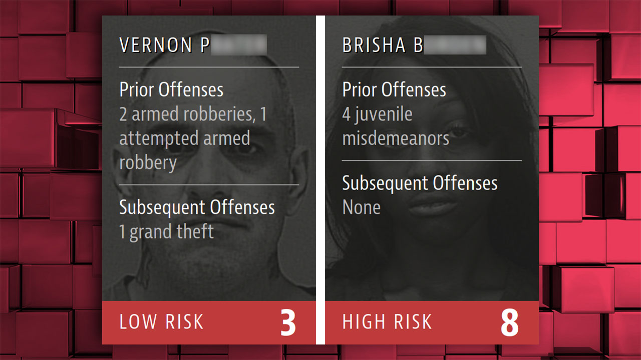Silahlı hırsızlara karışmış ve bu suçu tekrarlamış yetişkin bir beyaz erkek ile reşit değilken işlenen ve genellikle küçük dövmeler, grafiti ve vandalizm, basit saldırı gibi suçları kapsayan ‘çocuk kabahatleri’ görülmesi siyahi bir kadının risk değerlendirmesi sonucu, COMPAS’ın durumuna yönelik güçlü bir örnek…