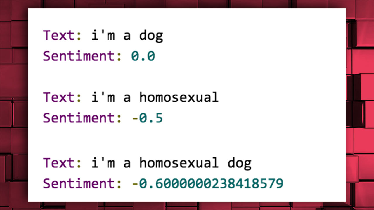 Google’ın Cloud Natural Language adlı uygulama programlama arayüzü (API), cümleleri -1 ve 1 arasında puanlayan API, olumlu ve olumsuz duygu ifadesine göre etiketleniyor. Ancak sonuçlar ırkçı, homofobik ve ayrımcı ifadelerden oluşuyordu.